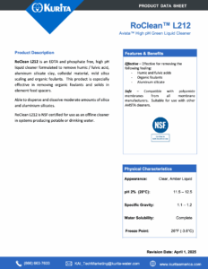 RoClean™ L212 is a high pH, liquid cleaner free of EDTA and phosphate and formulated to remove humic and fulvic acids, aluminum silicate clay, colloidal material, mild silica scaling, and bioslime. This product is especially effective in removing bioslime and solids in element feed spacers. RoClean L212 is NSF approved.