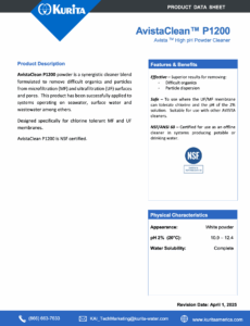 AvistaClean™ P1200 powder is a synergistic cleaner blend formulated to remove difficult organics and particles from microfiltration (MF) and ultrafiltration (UF) membrane surfaces and pores. AvistaClean P1200 has been successfully used on wastewater, municipal water, seawater and surface water. Designed specifically for chlorine tolerant MF and UF membrane systems.