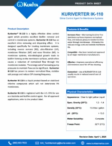 Kuriverter® IK-110 is a highly effective slime control agent which provides excellent biofilm removal and control in membrane systems. Kuriverter IK-110 has an excellent slime removing and dispersing effect. It is designed specifically for treating membrane systems, including reverse osmosis (RO), ultra-filtration (UF), membrane filtration (MF) and nano filtration (NF). In membrane systems, microbiological growth leads to biofilm forming on the membrane surfaces, which often causes a reduction of normalized flow through the membrane modules. The energy cost of increasing pump pressures to maintain flow can be significant. Kuriverter IK-110 has proven to restore normalized flow, stabilize salt passage and reduce CIP cleaning frequency.