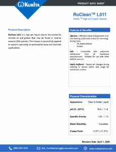 RoClean™ L011 liquid is a multicomponent, high pH buffered cleaner formulated to remove oil and grease that may be found in reverse osmosis (RO) systems used in wastewater reuse applications. RoClean L011 is highly buffered to resist pH changes during the cleaning process and contains a proprietary blend of buffers, low foaming surfactants, and chelants to dissolve organic foulants and disperse colloidal particles.