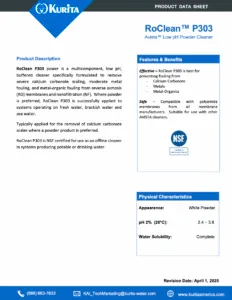 RoClean™ P303 is a multicomponent low pH buffered powder cleaner formulated to remove severe calcium carbonate scaling and moderate metal fouling and metal-organic complexes. Where powder is preferred, RoClean P303 is successfully applied to systems operating on seawater, brackish water, or wastewater. RoClean P303 is NSF approved.