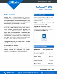 RoQuest™ 3000 is a liquid coagulant which contains a proprietary blend of organic polymers that is injected into the feedstream of multimedia and sand filters. It enhances filter performance by reducing turbidity and color to produce an improved filtrate that will reduce downstream cartridge filter, reverse osmosis (RO), and nanofiltration (NF) membrane fouling.