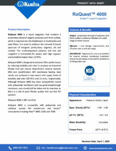 RoQuest™ 4000 liquid coagulant is an organic polymer and ferric sulfate blend used to enhance the removal of a broad spectrum of inorganic particulates, organics, silt, and colloids in multimedia filters. This multicomponent polymer and iron salt coagulant is formulated for waters with high organics and turbidites higher than 2.0 NTU. Although this product is membrane compatible, overfeeding of pretreatment chemicals is not recommended as it can affect organic and particulate removal. RoQuest 4000 is injected into the feedstream of multimedia and sand filters to enhance filter performance by reducing turbidity and color to produce an improved filtrate that will reduce downstream reverse osmosis (RO) and nanofiltration (NF) membrane fouling. RoQuest 4000 is NSF approved.