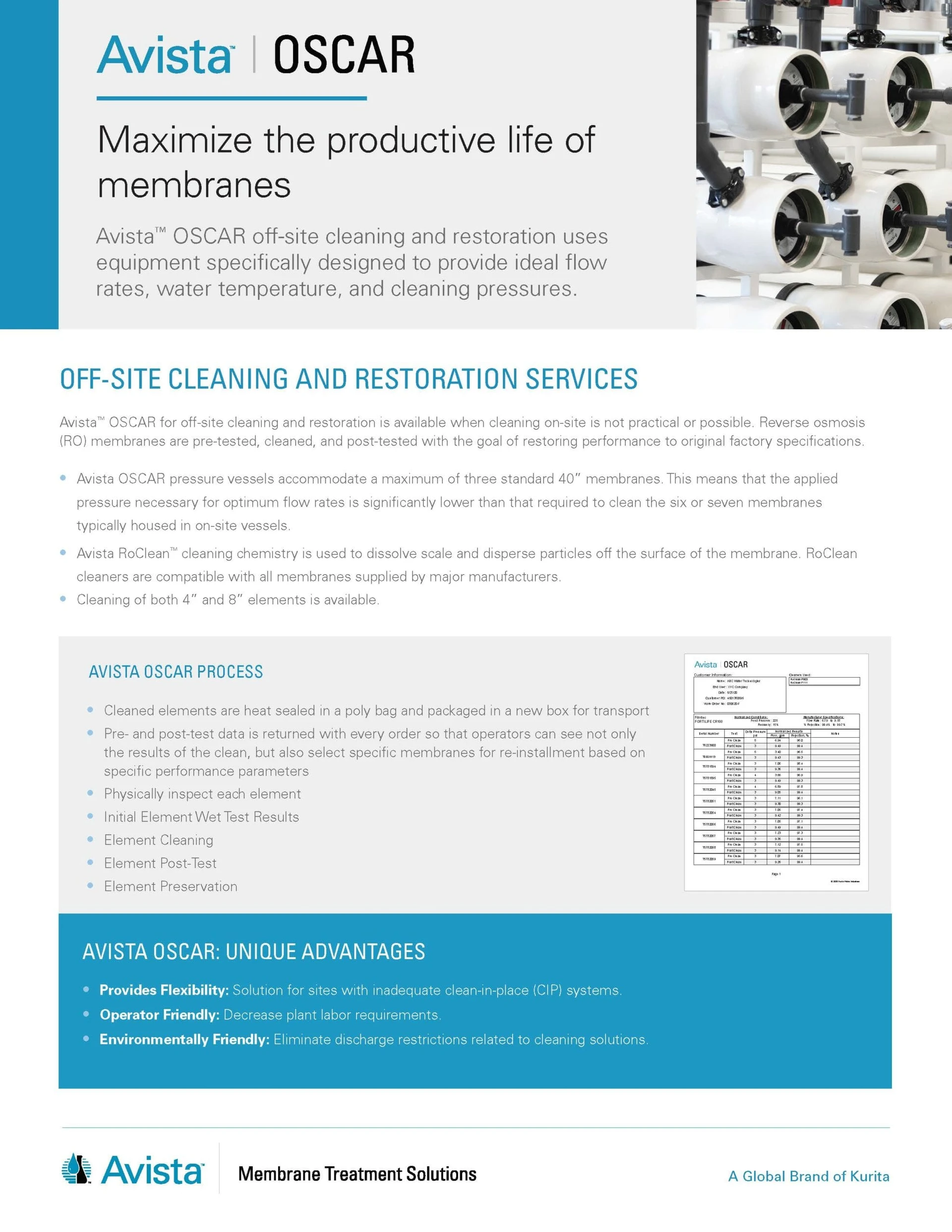 - Pre- and post-test data is returned with every order so that operators can see not only the results of the clean, but also select specific membranes for re-installment based on specific performance parameters
