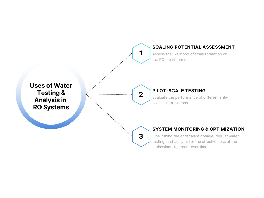In some cases, this involves running samples of a smaller-scale RO system with the selected antiscalant to monitor its effectiveness in preventing scale formation.